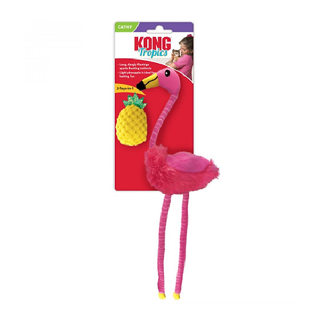 Los dos juguetes de KONG Cat Tropics Flamingo duplican la diversión y amplían las formas de jugar del gato. Las largas patas y el cuello del flamenco invitan a la diversión de arrastrar y atrapar, y crepitan para prolongar la acción que satisface el instinto. Una piña ligera atrae y recompensa la diversión del bateo. La hierba gatera KONG North American Premium en ambos juguetes mantiene la acción tropical.